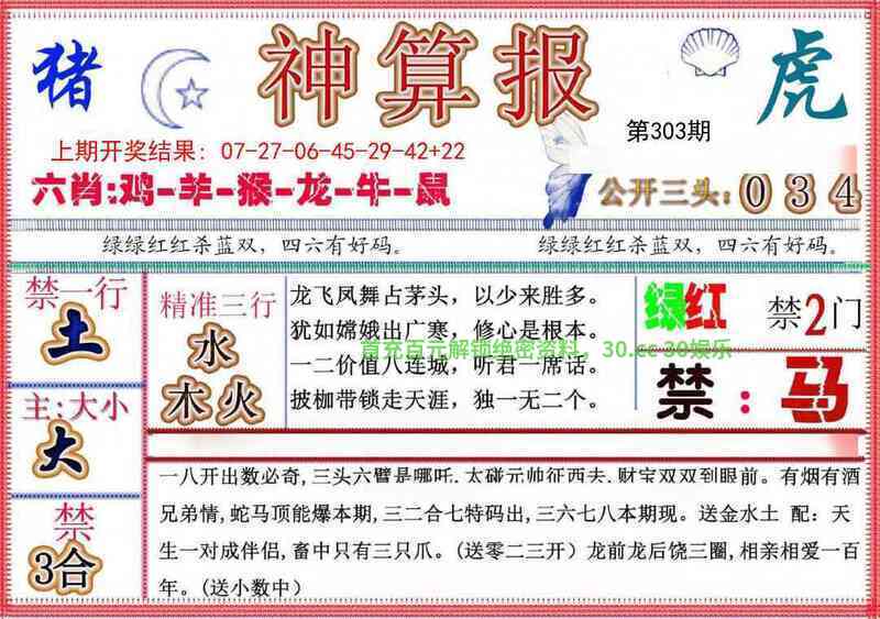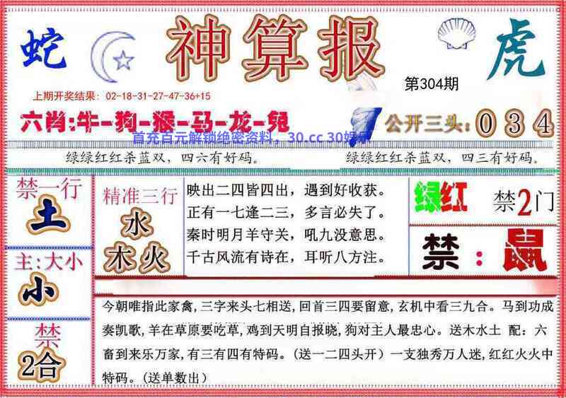 | 302期:七肖【龙鼠狗兔鸡虎牛】开:猴22错 |